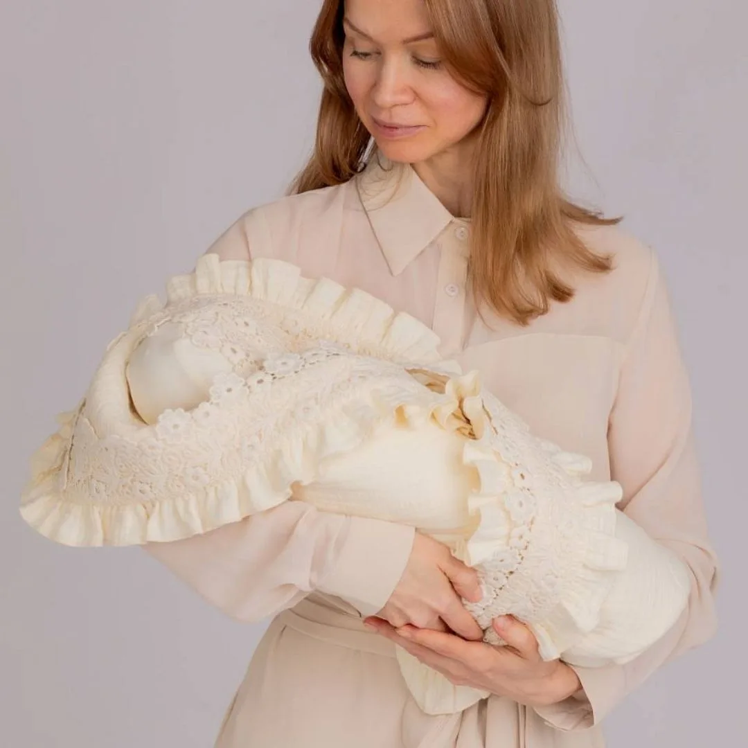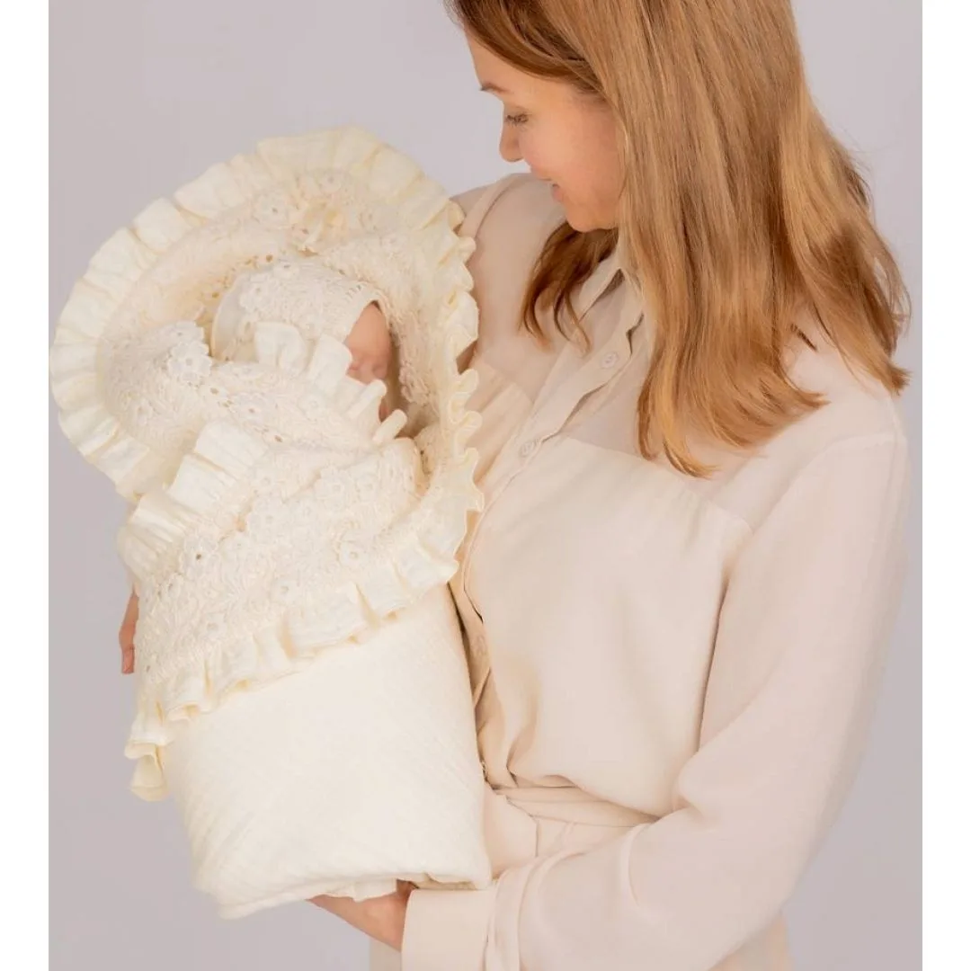 Плед муслин “Цветы” р. 95х95 выполнен в натуральном оттенке, что придает ему универсальный и спокойный вид. Изделие изготовлено из мягкого муслина, который приятен на ощупь и отличается хорошей воздухопроницаемостью. По краю плед украшен широкой декоративной оборкой с вышивкой, выполненной в виде цветочного узора, что подчеркивает аккуратный и изысканный дизайн. Можно использовать в качестве конверта на выписку из роддома, и на каждый после выписки.