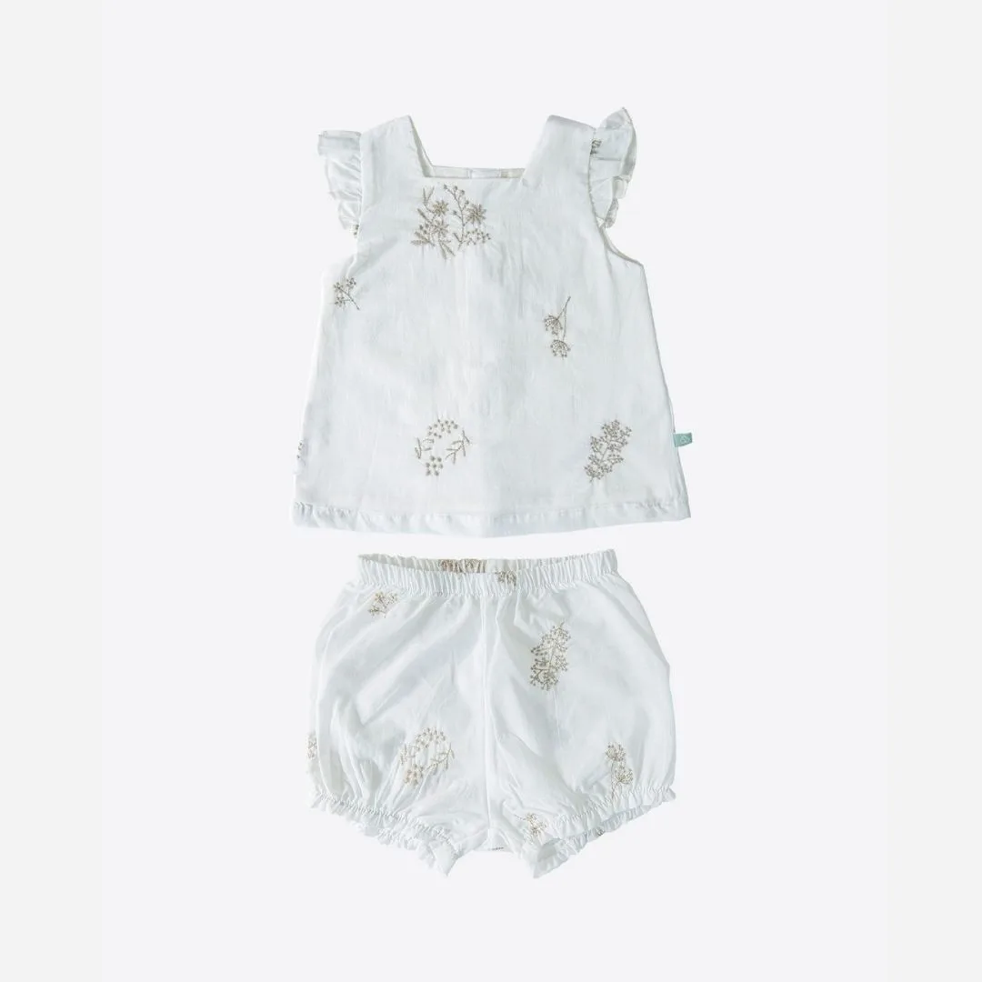 Невесомый летний комплект для девочки из муслина — натурального хлопка, который позволяет коже дышать даже в сильную жару. Мягкая текстура не раздражает нежную кожу ребенка, а свободный крой не сковывает движений.