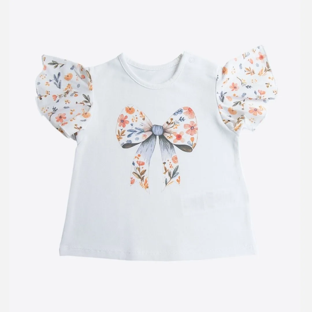 Нежная белая футболка для малышки с воздушными рюшами-крылышками. Мягкий трикотаж из хлопка с эластаном тянется и не сковывает движений — удобно носить весь день. Kitikate | S60779