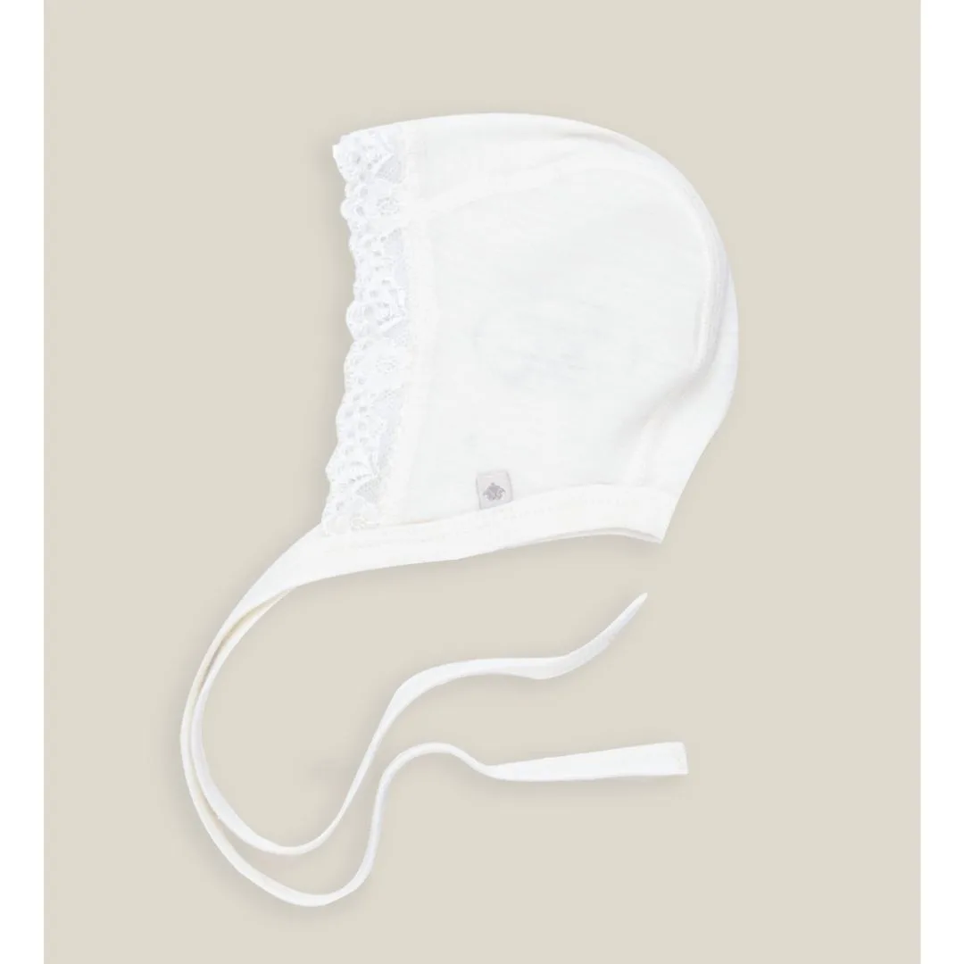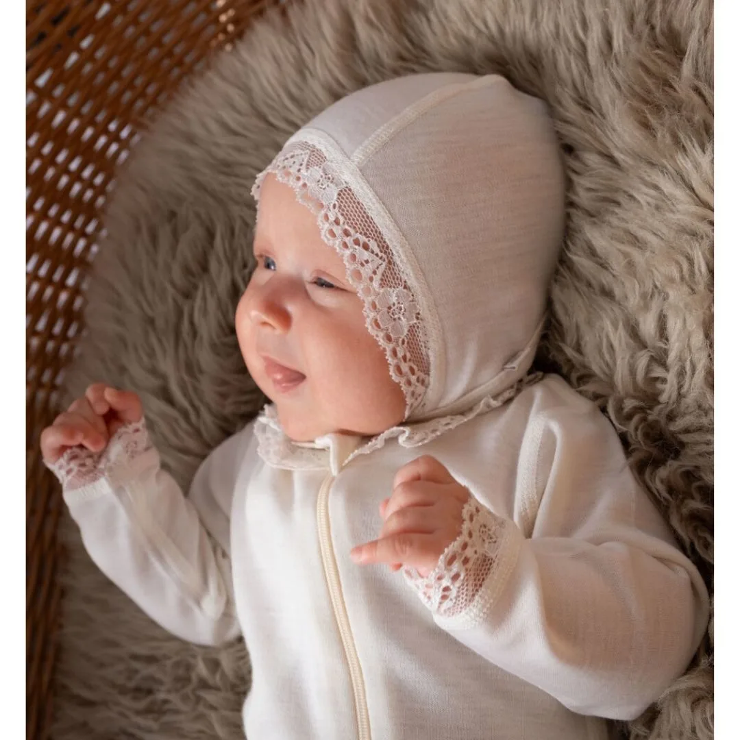 Чепчик для младенцев с кружевом 100% из шерсти мериноса. Теплый и уютный. Бесшовный. Идеальный головной убор для торжественных мероприятий.