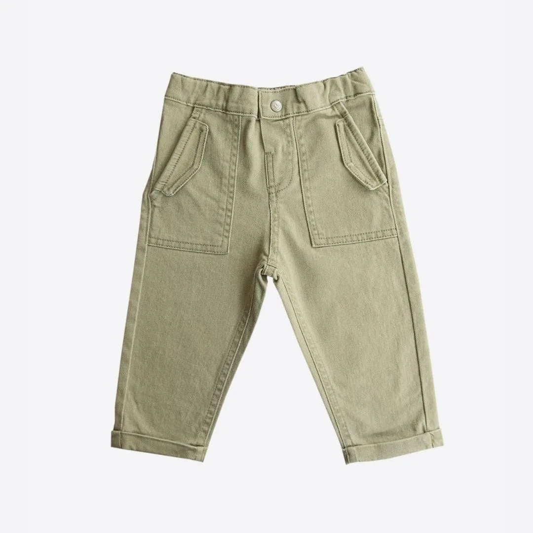 Удобные штанишки для активных малышей из мягкого хлопка с добавлением эластана. Благодаря составу ткань отлично тянется и не сковывает движения ребёнка — идеально для ежедневной носки. Нейтральный цвет хаки легко сочетается с любой одеждой и не маркий в носке.