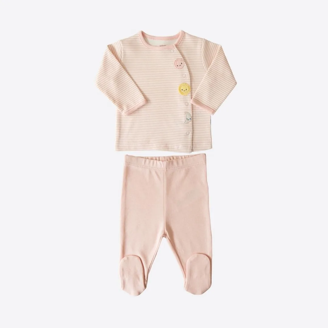 Двойка костюм для новорожденной девочки. В комплекте: распашонка и ползунки. Базовая одежда для новорожденного – продукция Kitikate выполнена из 100% органического и гипоаллергенного хлопка и сертифицирована международным стандартом GOTS (Global Organic Textile Standard). Цвет: полосатый розовый-белый.